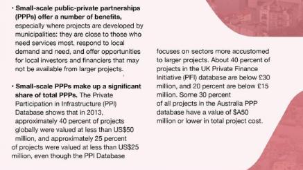 Well-designed and well-managed Public-Private Partnerships (PPPs) can deliver high-quality and cost-efficient infrastructure, helping municipalities address critical infrastructure needs in the face of rapid urbanization and limited public funds. This Municipal PPP Framework provides municipalities with a practical guide and set of tools to enable them to identify, prepare, deliver, and manage PPP projects. Although designed to support municipal governments and staff, and so written with their perspective in mind, it is also a useful resource for decision-makers and practitioners across a range of municipal infrastructure sectors and services.
