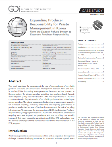 This study examines the expansion of the role of the producers of recyclable goods in the arena of Korean waste management between 1992 and 2010. In the late 1980s, increasing waste generation became a serious problem in Korean society. To initiate recycling activities, the producer-based Deposit Refund System (DRS) was introduced in 1992. The major feature of DRS was a combination of a deposit on sales of recyclable products with a refund upon proper recycling. The refund was expected to function as an economic incentive for increased recycling. However, under DRS the recycling performance of producers was limited because of the low deposit rate and the lack of recycling infrastructure. To overcome the shortcomings of DRS, the Extended Producer Responsibility (EPR) program replaced DRS in 2003. Under EPR, a mandatory recycling rate was imposed on producers and the recycling rate steadily increased. This study traces the transition from DRS to EPR and explains how the delivery challenges of DRS were addressed with the implementation of the EPR program.