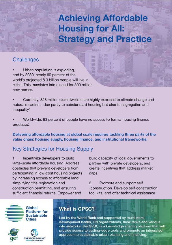 Urban population is exploding and by 2030, nearly 60 percent of the world's projected 8.3 billion people will live in cities. This translates into a need for 300 million new homes. Currently, 828 million slum dwellers are highly exposed to climate change and natural disasters, due partly to substandard housing but also to segregation and inequality. Worldwide, 93 percent of people have no access to formal housing finance products. Delivering affordable housing at global scale requires tackling three parts of the value chain: housing supply, housing finance, and institutional frameworks.