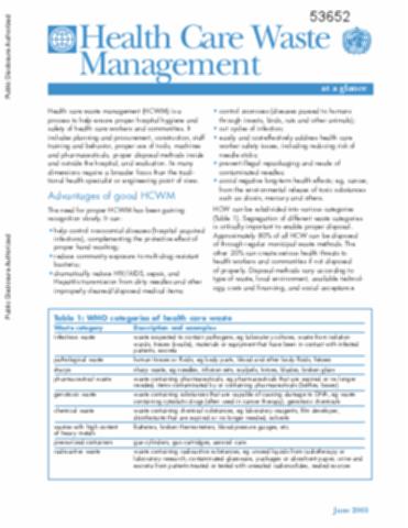 Health care waste management (HCWM) is a process to help ensure proper hospital hygiene and safety of health care workers and communities. It includes planning and procurement, construction, staff training and behavior, proper use of tools, machines and pharmaceuticals, proper disposal methods inside and outside the hospital, and evaluation. Its many dimensions require a broader focus than the traditional health specialist or engineering point of view. The need for proper HCWM has been gaining recognition slowly. It can: help control nosocomial diseases (hospital acquired infections), complementing the protective effect of proper hand washing; reduce community exposure to multi-drug resistant bacteria; prevent illegal repackaging and resale of contaminated needles; and easily and cost-effectively address health care worker safety issues, including reducing risk of needle sticks.