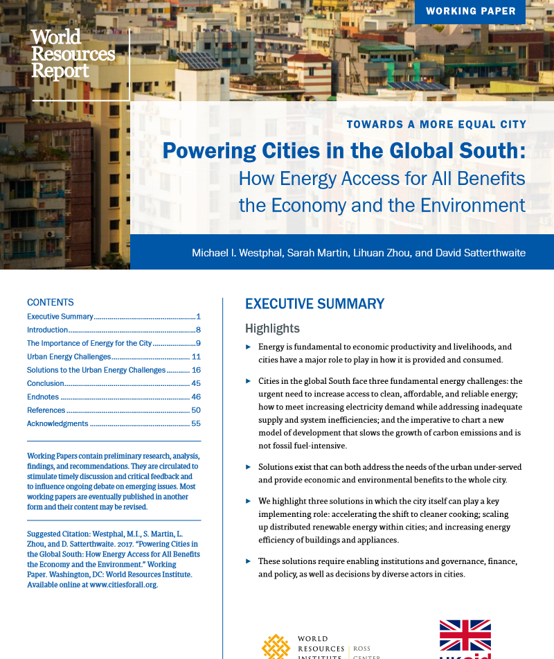 By 2050, it is projected that the world’s urban population will grow by 2.4 billion from 2015, with the growth concentrated mostly in Africa and Asia, creating unprecedented urban energy access challenges, especially for under-served populations. What’s more, the old carbon-intensive model of development undertaken in the global north is no longer tenable, given a greater concern for the health impacts of air pollution and the need to mitigate energy insecurity and climate risks. The latest installment of WRI’s flagship World Resources Report, “Towards a More Equal City,” provides solutions that can improve the health of residents, the environment and the overall economies of cities.