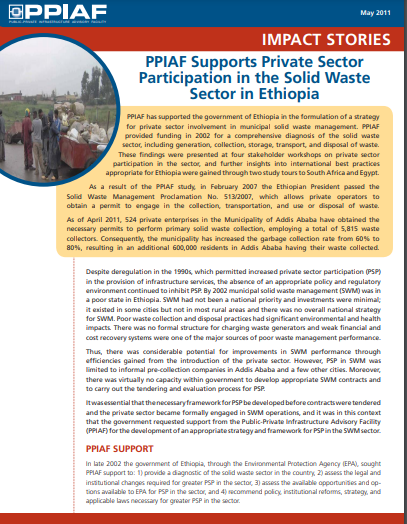 In 2002, PPIAF supported the government of Ethiopia in the formulation of a strategy for private sector involvement in municipal solid waste management sector, including generation, collection, storage, transport, and disposal of waste. The findings were presented at four stakeholder workshops on private sector participation in the sector.