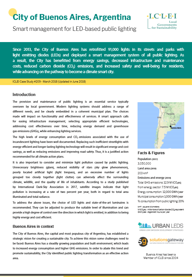 Local governments can lead on climate action through municipal service areas such as public lighting. Smart and connected public lighting system, which is also considered as an element of a samrt city, can address a range of different needs and therefore bring a range of benefits . This case study showcases the initiative launched by Buenos Aires where the City completed a LED retrofit project and deployed a smart management system for its public lighting network. Energy savings, decreased infrastructure and maintenance costs, reduced carbon dioxide (CO2) emissions, and increased safety and well-being for residents have been among reported results of taking this initiative in Buenos Aires. The study also brings the potential of replicating this initiative to the attention of local governments around the world.