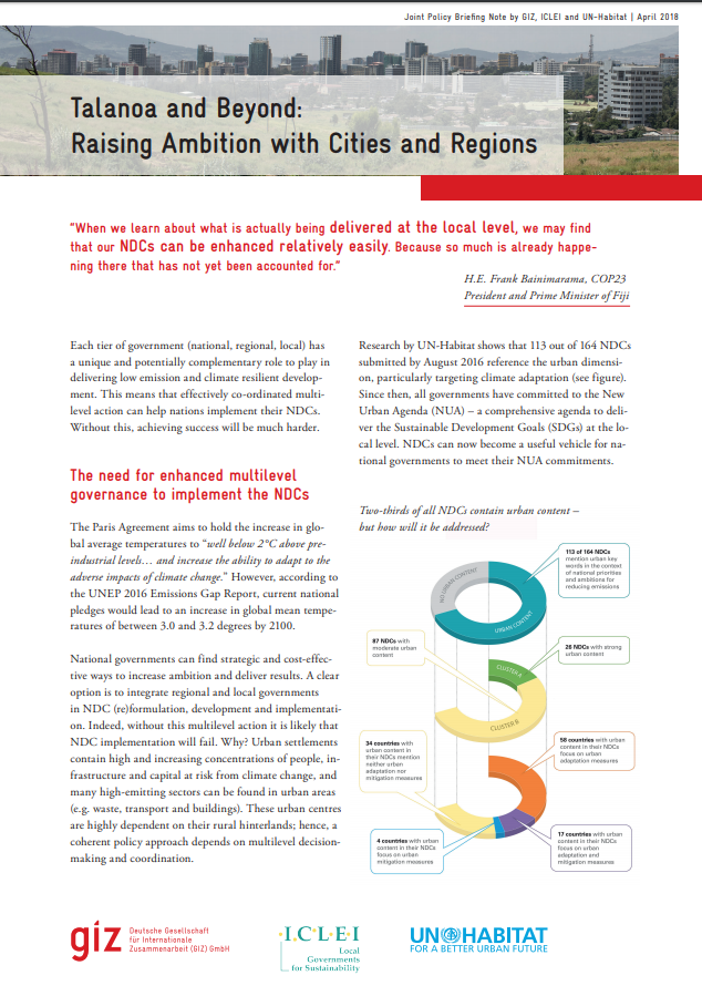 Each tier of government, including the national, regional and local levels, has a unique and potentially complementary role to play in delivering low emission and climate resilient development. This means that effectively coordinated multilevel action can help nations implement their Nationally Determined Contributions (NDCs). This joint policy briefing explores the need for enhanced multilevel governance to implement the NDCs.