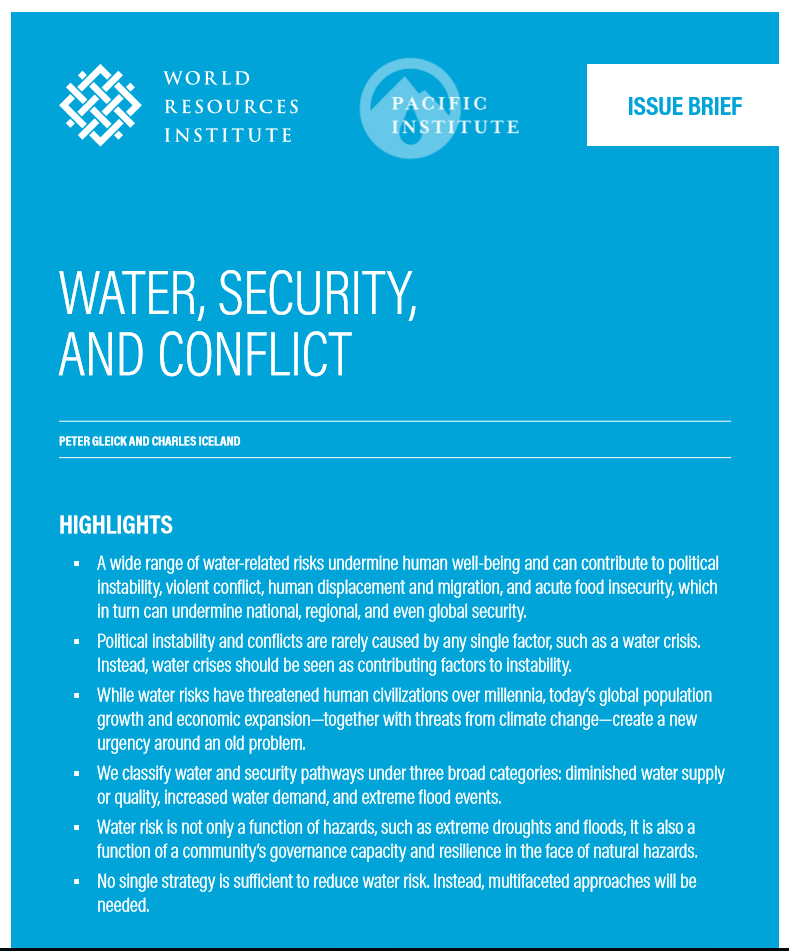 This paper summarizes our current understanding of water and security threats and their links to conflict, migration, and food insecurity. It is intended for professionals in the defense, diplomacy, and development fields. We review the key drivers behind growing water risk, describe and illustrate water and security pathways, and present approaches for reducing water related risks to global security.
